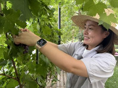 步入葡萄园,果香馥郁,沁人心脾。员工们兴致勃勃地化身“采摘能手”,手持工具,穿梭于绿意盎然的藤蔓之间。伴随着清脆的剪刀声,一串串晶莹饱满、汁水丰盈的葡萄轻盈落入篮中,满载着自然的馈赠与劳动的成果。